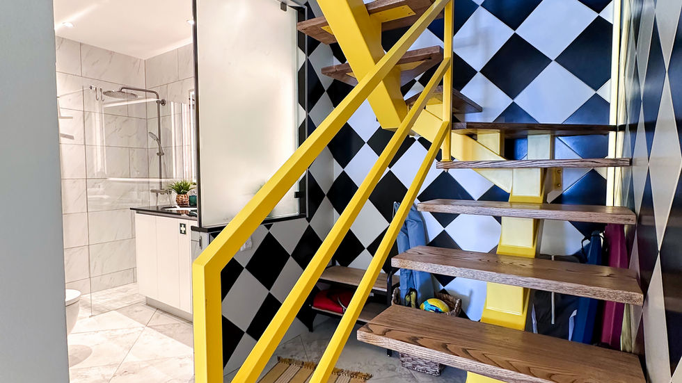 One of the kitchen area’s standout features is the glass ceiling, allowing subdued natural light to flood the entire space. Another feature, is the striking staircase with its black-and-white checkered wall tiles and vibrant yellow and chestnut-wood steps, extending over 12 meters high. It evokes a whimsical "Alice in Wonderland" atmosphere…
